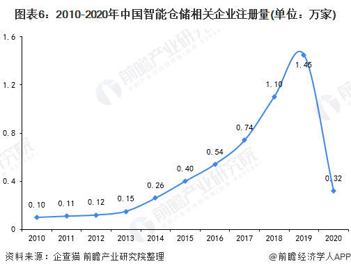 在各大電商平臺、物流企業的倉儲管理逐步向智能化和數字化轉型的背景下,我國無人倉儲領域熱度不減,不斷有新玩家進入。根據企查貓數據顯示,目前我國有超150萬家倉儲相關企業,其中智能倉儲已突破6萬家。2010年以來,智能倉儲相關企業新注冊量不斷增長,2019年約為1.45萬家,2010-2019年我國智能倉儲新注冊企業數量增長超14倍。