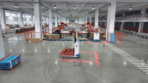 在與某衛浴企業的合作中,宇鋒智能從鋁材、玻璃、配件、包材的來料,到打框、裝車、裝柜發貨結束的整個智能化生產車間建設全程把控,過程中包含從存儲區運用堆垛機、AGV、RGV等智能化設備的組合使用,配套智能化管理系統,將物料配送至組裝生產車間工位,經過組裝等生產環節后的成品場內運輸、存儲。通過各環節感知傳感器,將底層信息上傳至中控管理系統,通過三維實時展示的方式,實現數字孿生,實現了為企業的降本增效和數字化生產建設效果。
