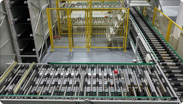原材料倉作為供應鏈的起點,承擔粉漿、箔材及組裝物料等關鍵原料的存儲與配送。宇鋒智能設計了以托盤為載體的存儲模式,并結合樓層提升機、滾筒輸送機等自動化設備,實現了跨樓層的高效轉運和按需供給。通過數字化管理平臺,企業能夠實時監控庫存狀態并動態調整調度,保障生產前端物料供應的及時性與準確性。