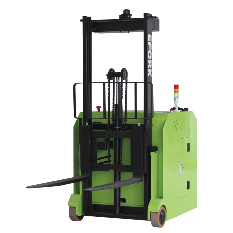 堆高式(根據(jù)不同的功能分別寬支腿,蓋板式,前移式),標準蓋板式AGV的貨叉及兩條支腿在車體前方,而貨叉可上下升降,當下降到一定高度時,叉間距與物料托盤下的兩個空檔吻合,使其支腿進入叉起托盤貨物,移載過程須通過倒車才能完成,托盤存放時必須與地面有一定高度,以保證貨叉及下方的兩個支腿同時進入實現(xiàn)搬運過程。