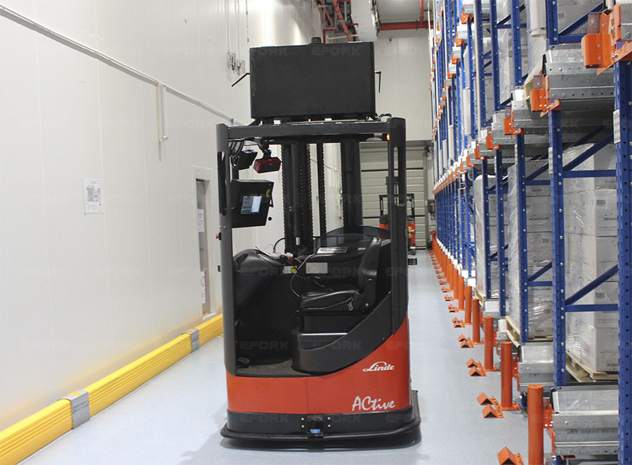 叉車改造AGV:本次客戶現(xiàn)場使用的是林德R14S系列電動托盤堆垛車,安徽宇鋒在現(xiàn)有叉車上安裝有可旋轉(zhuǎn)的激光掃描器,在運(yùn)行路徑沿途的墻壁或支柱上安裝有高反光性反射板的激光定位標(biāo)志,AGV叉車依靠激光掃描器發(fā)射激光束,然后接受由四周定位標(biāo)志反射回的激光束,車載計(jì)算機(jī)計(jì)算出車輛當(dāng)前的位置以及運(yùn)動的方向,通過和內(nèi)置的數(shù)字地圖進(jìn)行對比來校正方位,從而實(shí)現(xiàn)物料自動搬運(yùn)。