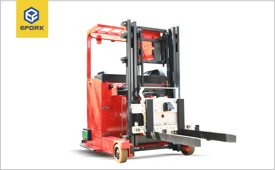 前移式叉車AGV的門架或者貨叉架可以前后移動伸出到前輪之外叉取或放下貨物,行走時貨叉帶貨物收回,使貨物重心在支撐面內;EFORK前移AGV有兩條前伸的支腿,可以起到穩定作用。具有高舉升,大載重,小體積等特點。