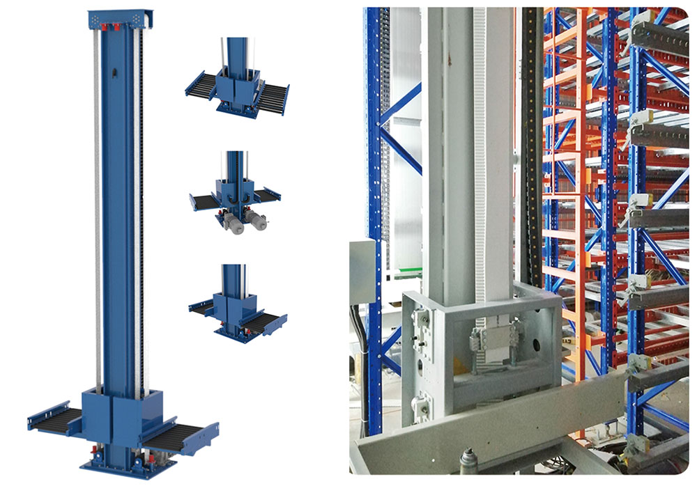 提升機負責垂直方向.上的物料搬運及車輛換層鏈式提升:提升機用鏈條代替鋼絲繩,避免了傳統提升機經常碰到的鋼絲繩斷股或變形量大等問題,保證了提升機的安全穩定性。雙重制動: -為二維碼系統,二為電機上的編碼器,保證了制動信息的可靠性,實現提升平臺的穩定運行,避免沖頂及觸底事故。提升機前端設計有緩存機構,既可以進行貨物的輸送也可以作為四向車進出提升的運行通道,并且可以提高效率。